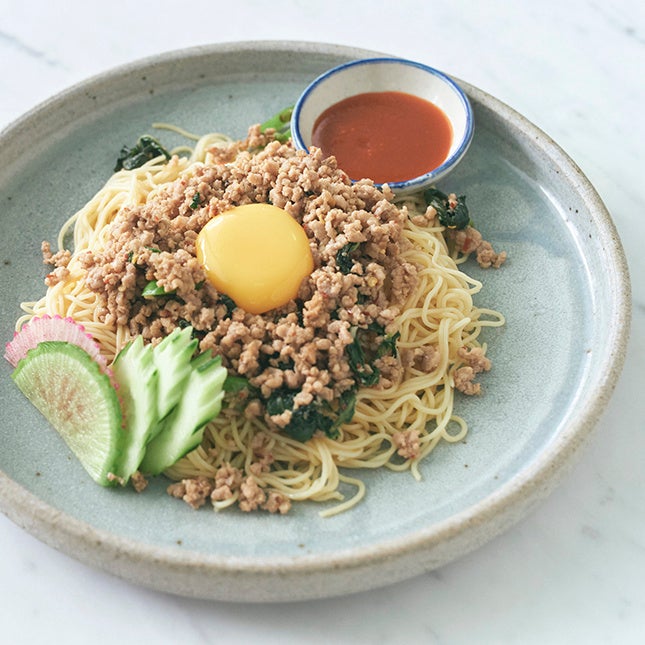 細麺は挽肉と一緒に食べる時も相性がバッチリです。卵と和えて濃厚な味わいにチリソースを途中でかけて辛味と酸味を加えて味変してください。ちょっと名古屋風な和え麺も麺に主張のあるZENBヌードルと一緒なら具材に負けないで美味しく食べられます。