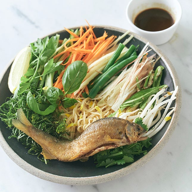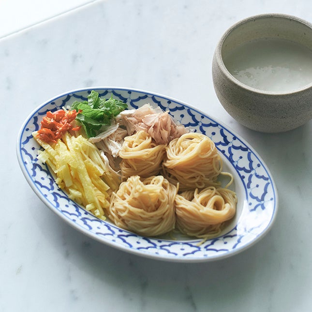タイでは魚を油で揚げてその身をデンブのように細かくほぐしフレークにして、茹でた麺とインゲンや香草を一緒にサラダのように食べます。今回は日本で手に入りやすい薬味と季節の鮎でレシピを作りました。ポイントは魚をカリッと水分を抜いてあげることです。魚の肝の苦味やナンプラーの旨みに、野菜のみずみずしさが加わり暑い日にもぴったりです。トッピングにナッツなどを入れてもおいしく召し上がれます。