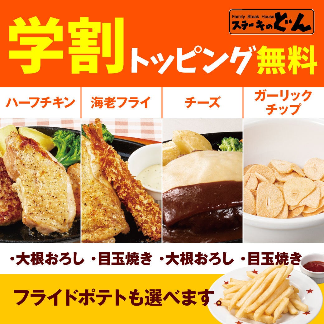 「ステーキのどん」では、2022年7月29日(金)より全店で学割キャンペーン【トッピング全品どれでもおひとつ無料】を実施し、夏休みの学生さんを応援します。