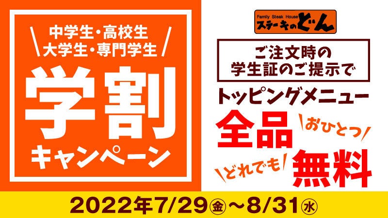 「ステーキのどん」では、2022年7月29日(金)より全店で学割キャンペーン【トッピング全品どれでもおひとつ無料】を実施し、夏休みの学生さんを応援します。