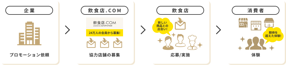 個性的な飲食店(イートイン・テイクアウト・デリバリー)とタイアップで行う、“体験型”のプロモーションサービスです。当社が2003年から運営する、飲食店経営・運営支援プラットフォーム「飲食店.COM」の会員24万人から協力店舗をアサインいたします。