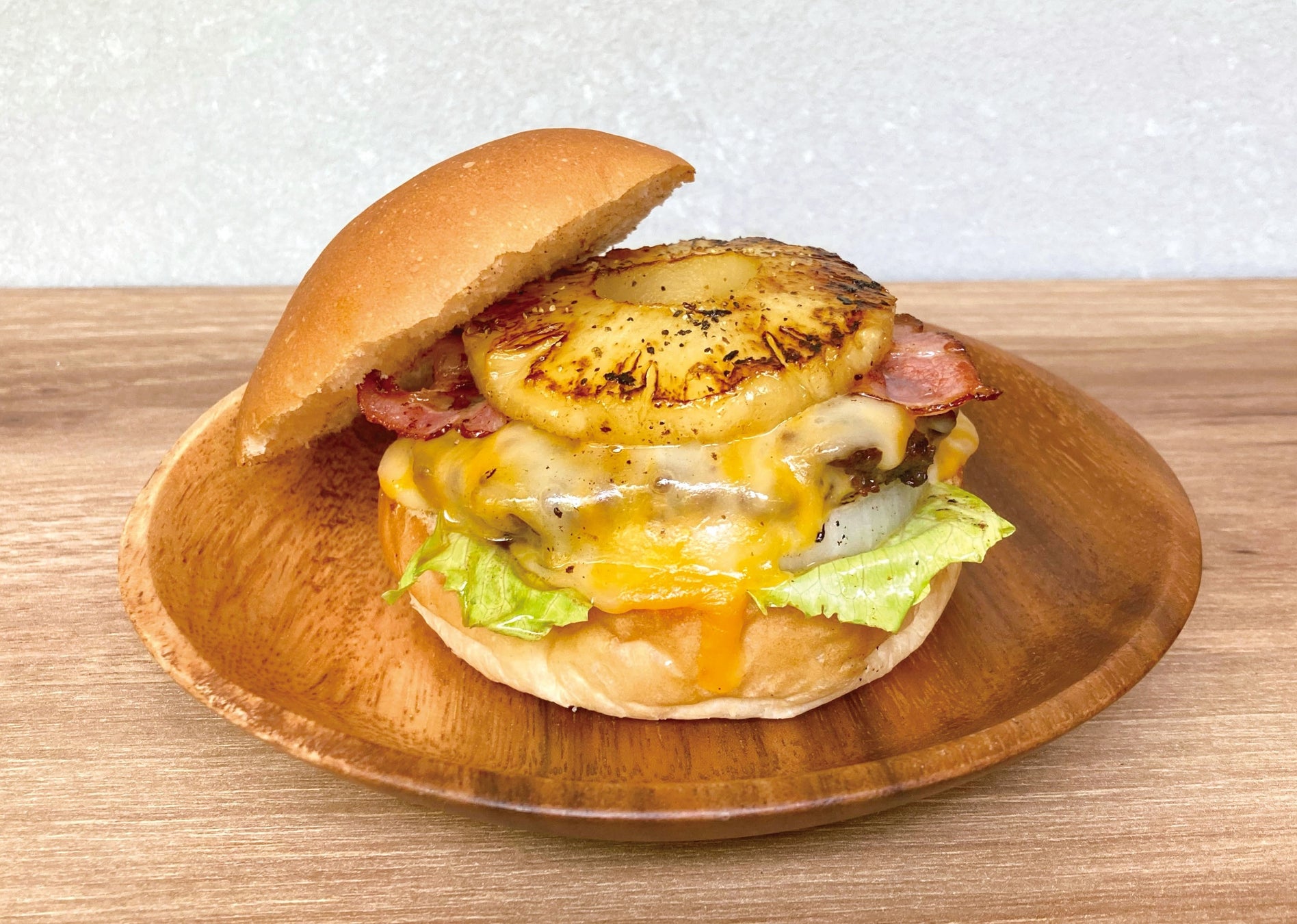 牛肉100%(つなぎ不使用)の ”ゴロッ” とした食べ応えあるスパイスの効いたパティと一緒に、グリルオニオンや塩気の効いたベーコン、こんがりとグリルした完熟パイナップル、食欲そそるコルビージャックチーズをトッピングし、自家製バーベキューソースをベースに、アレンジしたオリジナルソースは、フルーティーで甘みのあるソースで仕上げました。パイナップルの甘みとスパイシーな味わいがマッチした贅沢な味わい 『ハワイアン コルビージャックチーズバーガー』 を、サイドメニューや自家製ドリンクとともに、ぜひご賞味ください!