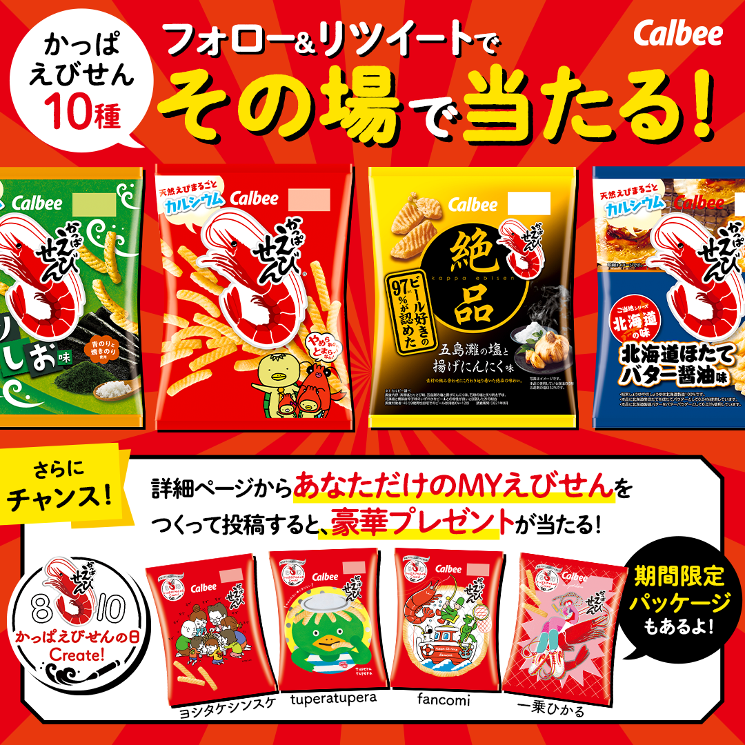 8月10日の「かっぱえびせんの日」に向けて、あなたが描いた“MYえびせん”を応募サイトから募集します。4名の人気クリエイターがデザインを審査し最優秀賞作品は2023年8月に全国で発売商品のパッケージデザインとして採用されます。