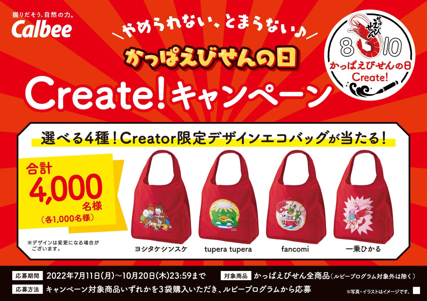 対象商品を3袋購入して、「カルビールビープログラム」にて応募すると、クリエイター限定デザインエコバッグが、抽選で4,000名様に当たるキャンペーンを実施します。