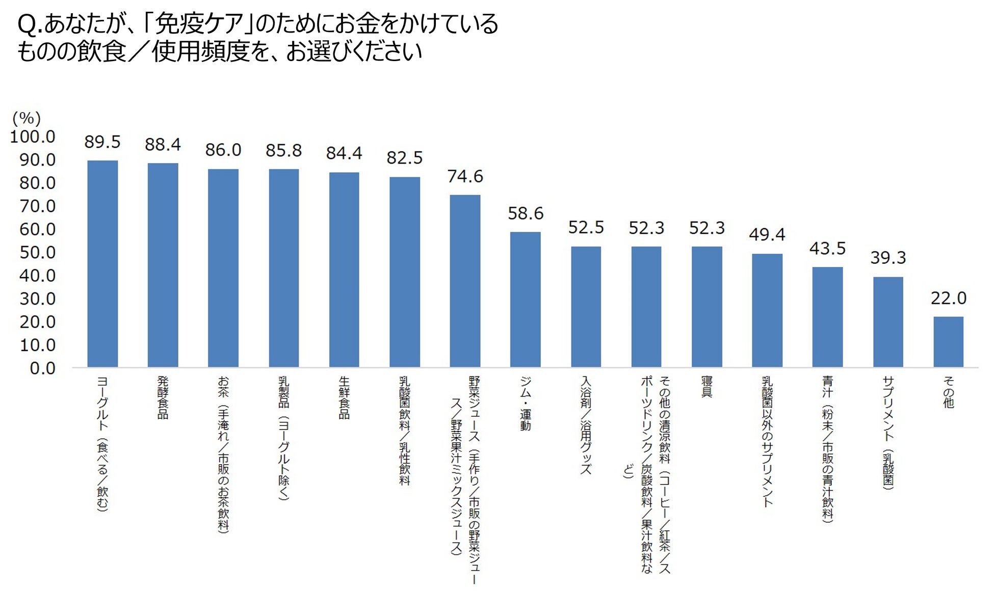 同調査では、自分や家族の「免疫ケア」をするための行動が必要だと回答した方は約9割、さらに「免疫ケア」へ継続的にお金をかけている人は約4割にのぼります。お金をかけている内容としては、ヨーグルト、発酵食品をはじめとする食品・飲料が多く、乳酸菌サプリメントも約4割となりました。