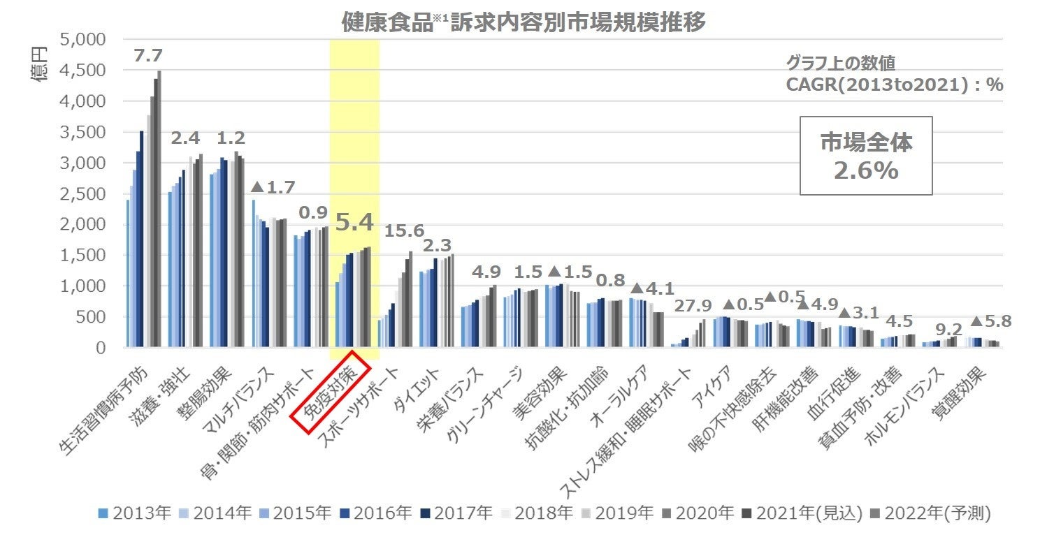 健康食品(サプリメント・食品・飲料)における調査※1では、全21カテゴリーのうち、「免疫対策」は6番目に大きなカテゴリーです。2013年~2021年における健康食品市場全体の年平均成長率2.6%に対し、「免疫対策」の年平均成長率は5.4%と高水準を維持しており、2022年以降も継続的な成長が期待されています。