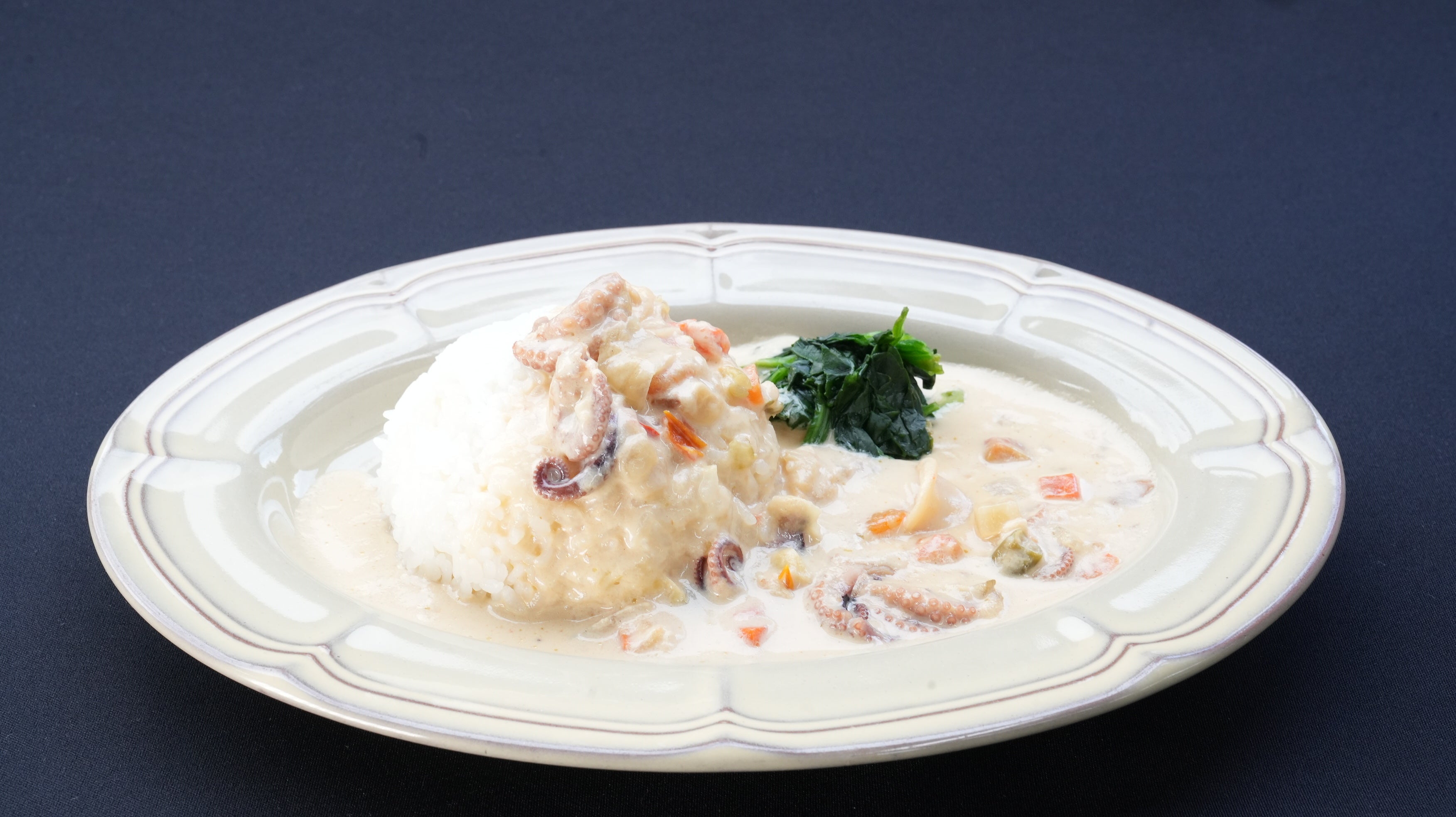 見た目はホワイト、でもスパイシー!10種の野菜で煮込んだソースとシーフードがごろごろ詰まったカレーです。