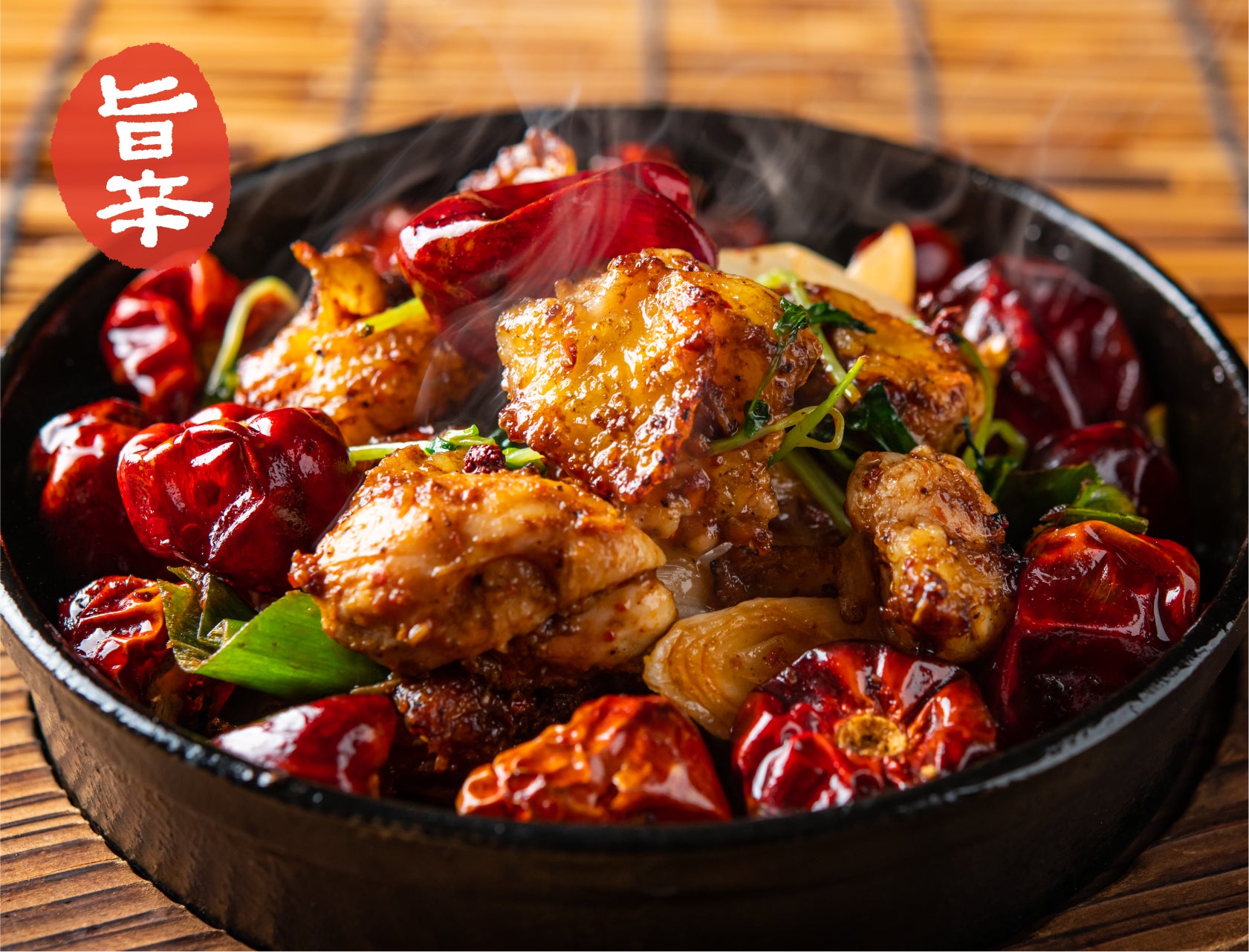 炭火で丁寧に焼いた地鶏に、香り立つ四川風のスパイスと自家製ラー油の刺激、豆板醤の辛さが複雑に絡み合う、夏だからこそ!の地鶏炭火焼です。