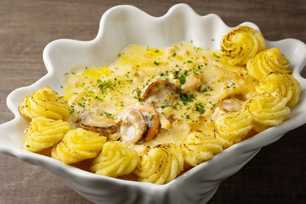 帆立を使ったグラタン料理。コク深い芳醇なソースと海鮮の香り漂う逸品です。