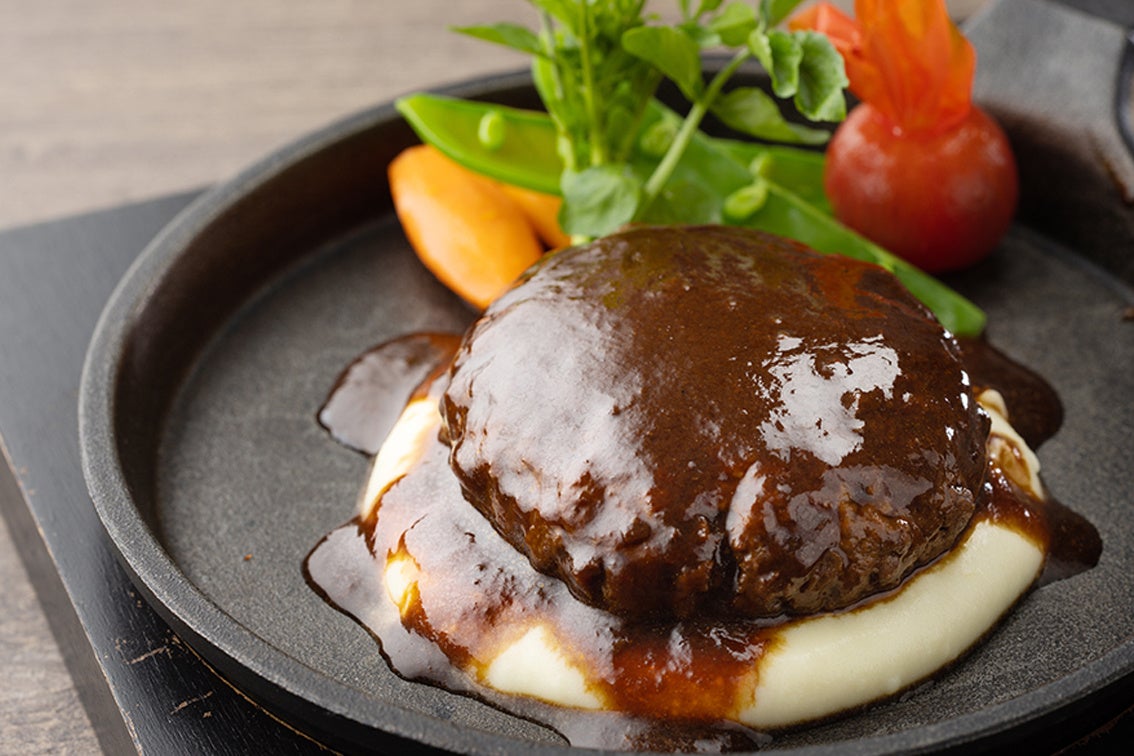 ふわっとジューシーなハンバーグに定番のデミグラスソースを添えて。トリュフの香り漂うマッシュポテトと一緒にお楽しみいただけます。