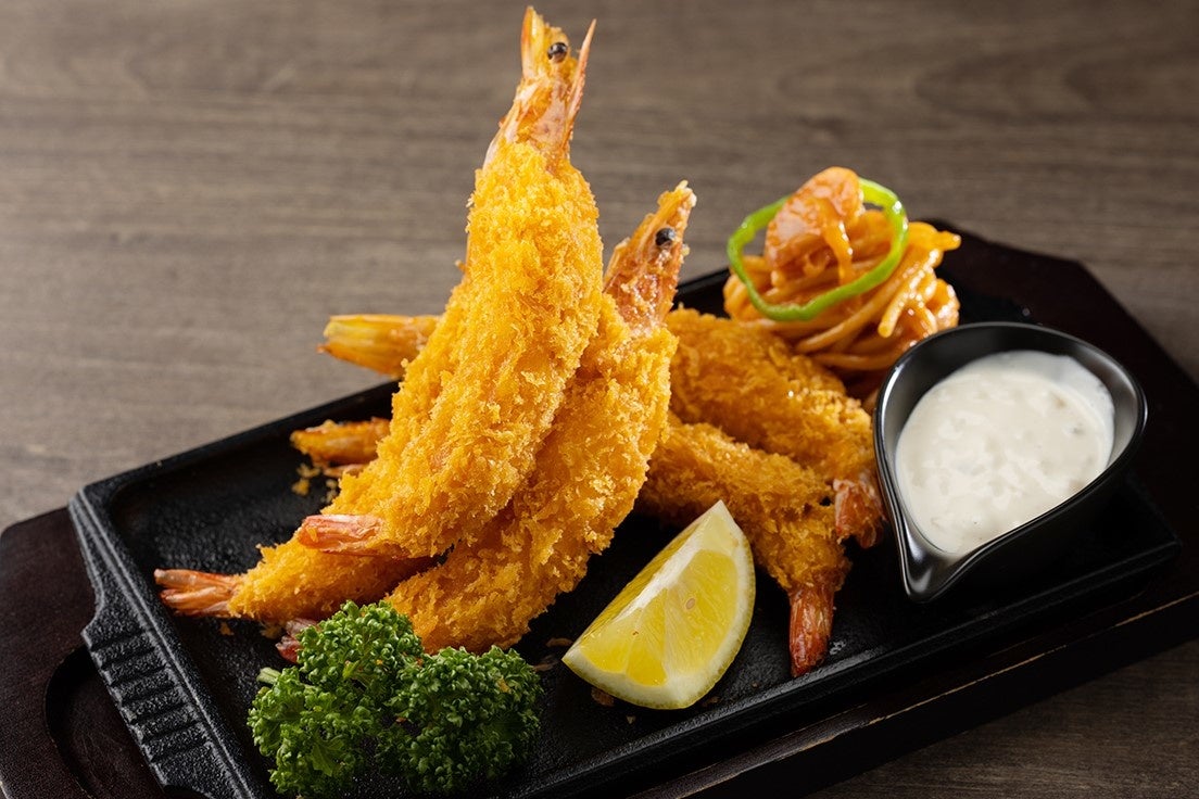 プリプリの食感がたまらない人気の海老フライを丸ごと一尾でご提供。お好みでタルタルソースとともにお召し上がりいただけます。