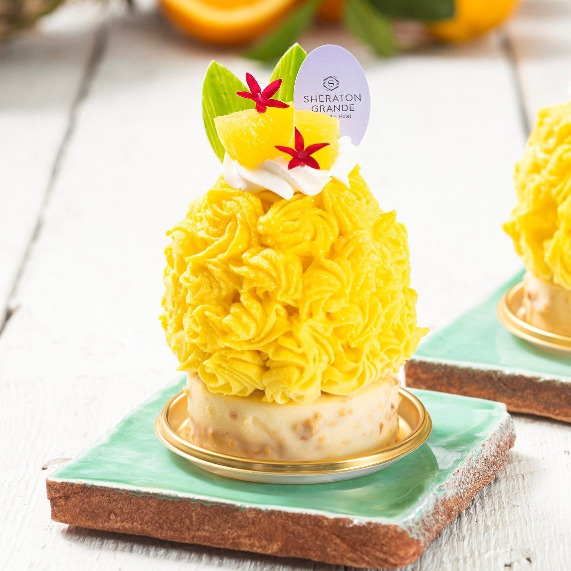 ホワイトチョコレートとアーモンドでコーティングしたオレンジムースに、ココナッツのダックワーズと、パイナップルとオレンジのゼリーを閉じ込めたパイナップルのムースをのせ、黄色いチョコレートで色付けしたココナッツクリームをたっぷりとかぶせました。最後にパイナップルのコンポートと葉っぱの形をしたホワイトチョコレートを飾り、まるでパイナップルのような見た目に仕上げた、かわいらしいムースをお楽しみください。