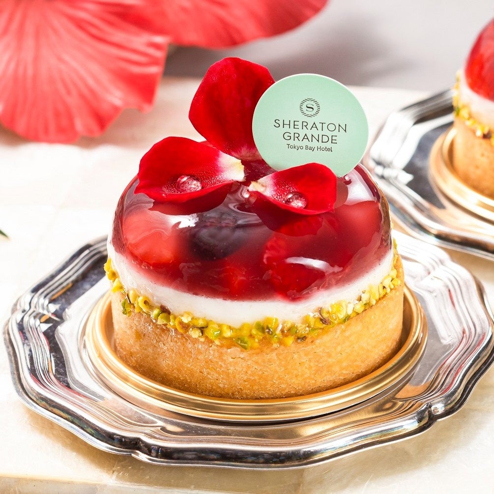 ハイビスカスの茶葉を練り込んだクレームダマンドとフランボワーズを入れたタルト生地に、ホワイトチョコレートのムースと、ドーム型のハイビスカスゼリーを重ねました。ゼリーには、ラズベリー、ブルーベリー、ストロベリーを閉じ込め、タルトの周りにはピスタチオをまぶしています。トップに鮮やかな赤いバラを飾り、ちょっぴり大人な雰囲気のタルトに仕上げました。
