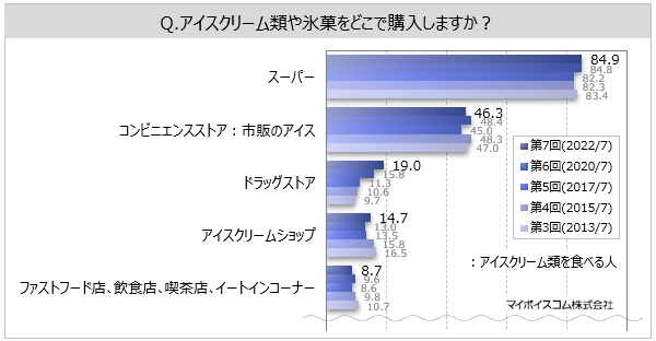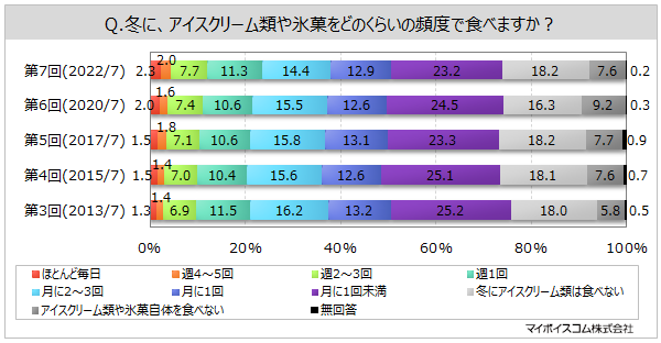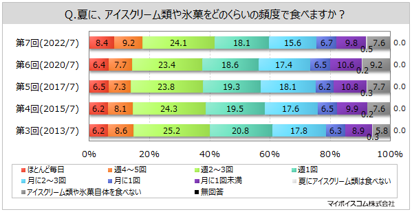 | <今 回>(2022/7)https://myel.myvoice.jp/products/detail.php?product_id=28805 ※上記設問の他に「直近1年間に食べたアイスクリームの銘柄」「アイスクリームを食べる際の重視点」も聞いています。 <第6回>(2020/7)https://myel.myvoice.jp/products/detail.php?product_id=26402 <第5回>(2017/7)https://myel.myvoice.jp/products/detail.php?product_id=22804 |