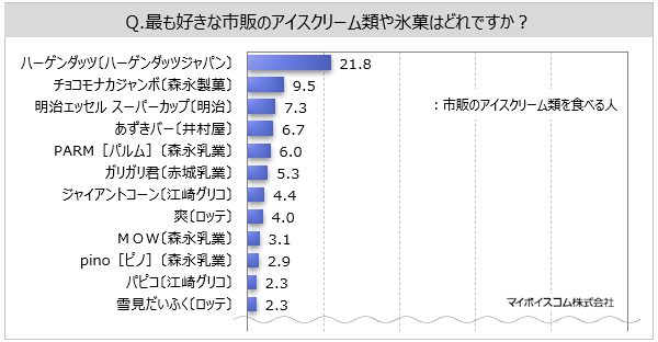 市販のアイスクリームを食べる人が最も好きな銘柄は、「ハーゲンダッツ」が21.8%、「チョコモナカジャンボ」「明治エッセル スーパーカップ」「あずきバー」が7~9%となっています。男性10・20代では「ガリガリ君」が1位です。