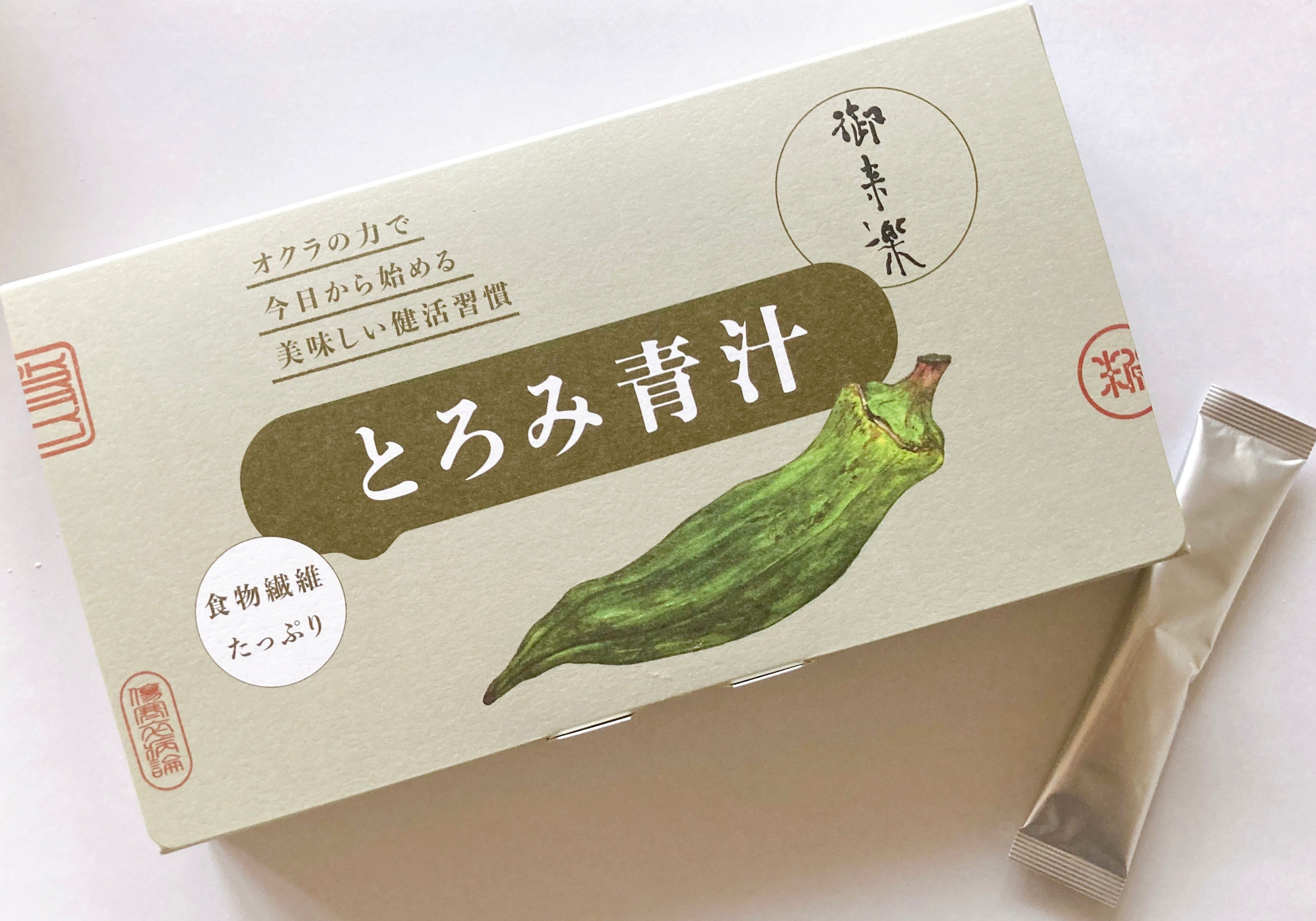 オクラをベースにした珍しい青汁で、生鮮では保管期間が限定されるオクラをより長く楽しめるよう粉末にしたオクラパウダー「御来楽(おくらく)」を原料として使用しています。そのため、不足しがちな食物繊維を手軽に摂ることができます。また、大麦若葉が緑茶のような爽やかな味わいであるため飲みやすく、オクラの粘りによる自然なとろみが魅力です。