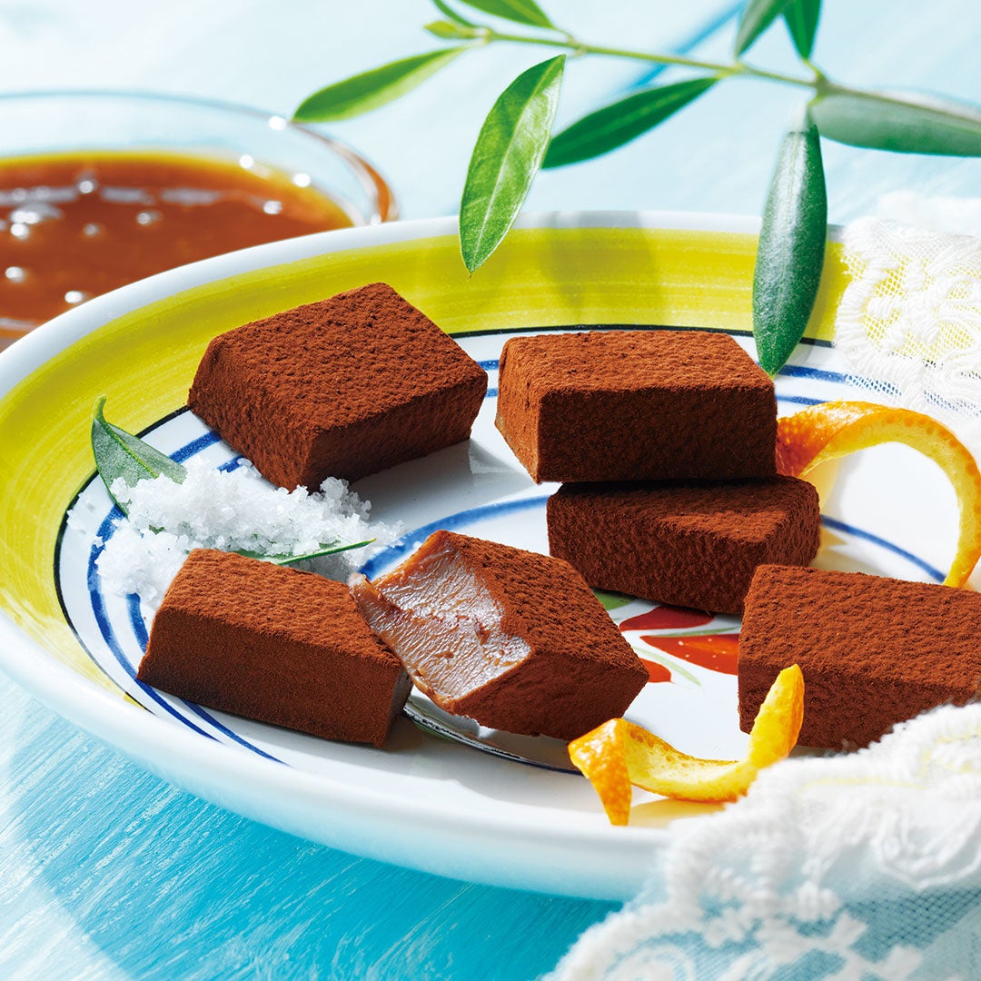 キャラメル風味のチョコレートにフランス・ブルターニュ地方名産の「ゲランドの塩」を効かせ、オレンジピューレを加え、バニラとオレンジのお酒で風味づけした生チョコレート。キャラメルの甘さとゲランドの塩の塩味の絶妙なバランス、華やかに香るオレンジの風味をお楽しみください。