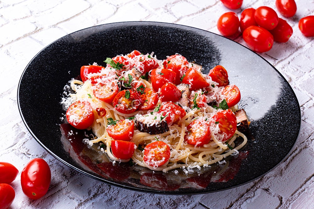 ■メニュー名:北海道プレミアムミニトマト「純あま」と「農家のベーコン」のペペロンチーノ