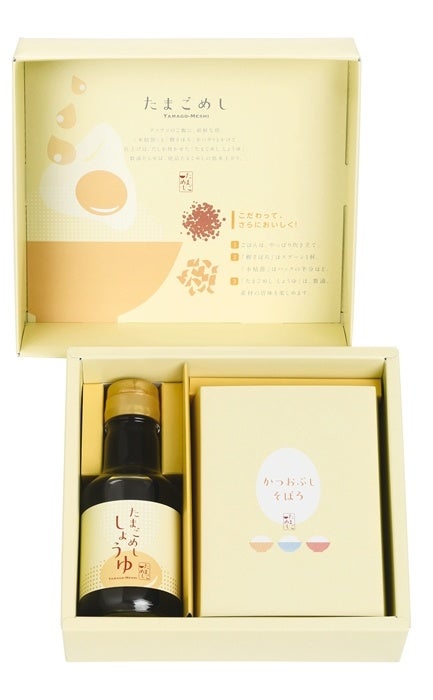 パステルイエローの可愛らしいパッケージに、「たまごめし」をさらに美味しくする、風味豊かな本枯節、甘辛に煮詰めた鰹そぼろ、そしてだしを利かせた専用醤油を詰め合わせました。
