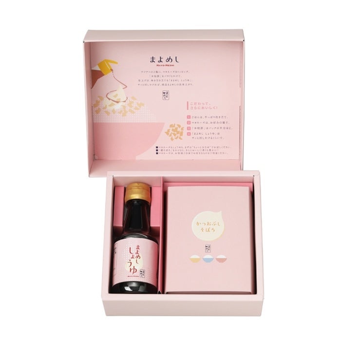 こちらは、優しいさくら色のパッケージに、「まよめし」をさらに美味しくする風味豊かな本枯節、甘辛に煮詰めた鰹そぼろ、そしてマヨネーズと相性の良い濃口醤油を詰め合わせました。