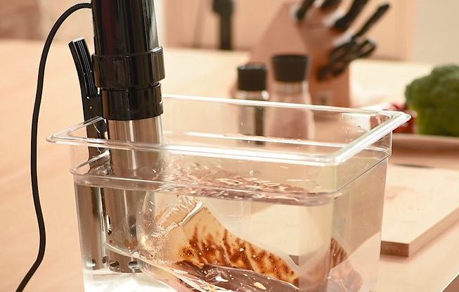 1979年にフランスで開発され、「焼く」「蒸す」「煮る」に次ぐ、「第四の調理法」とも呼ばれる調理法です。あらかじめ下処理・下味付けした食品をフリーザーバック等に入れ、60~90℃前後の低温で「火入れ」を行います。
