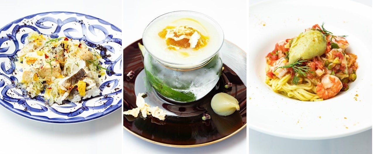 (右)淡路産ふわとろナスのピューレで和えた冷製パスタ カレー風味 夏野菜のマチェドニアと小海老添え 1,900円
