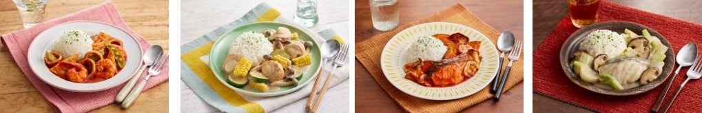 *左から、えびといかと春野菜の完熟トマトガーリックソース、ほたてと夏野菜のきのこクリームソース、さけと秋野菜の完熟トマトガーリックソース、たらと冬野菜のきのこクリームソース
