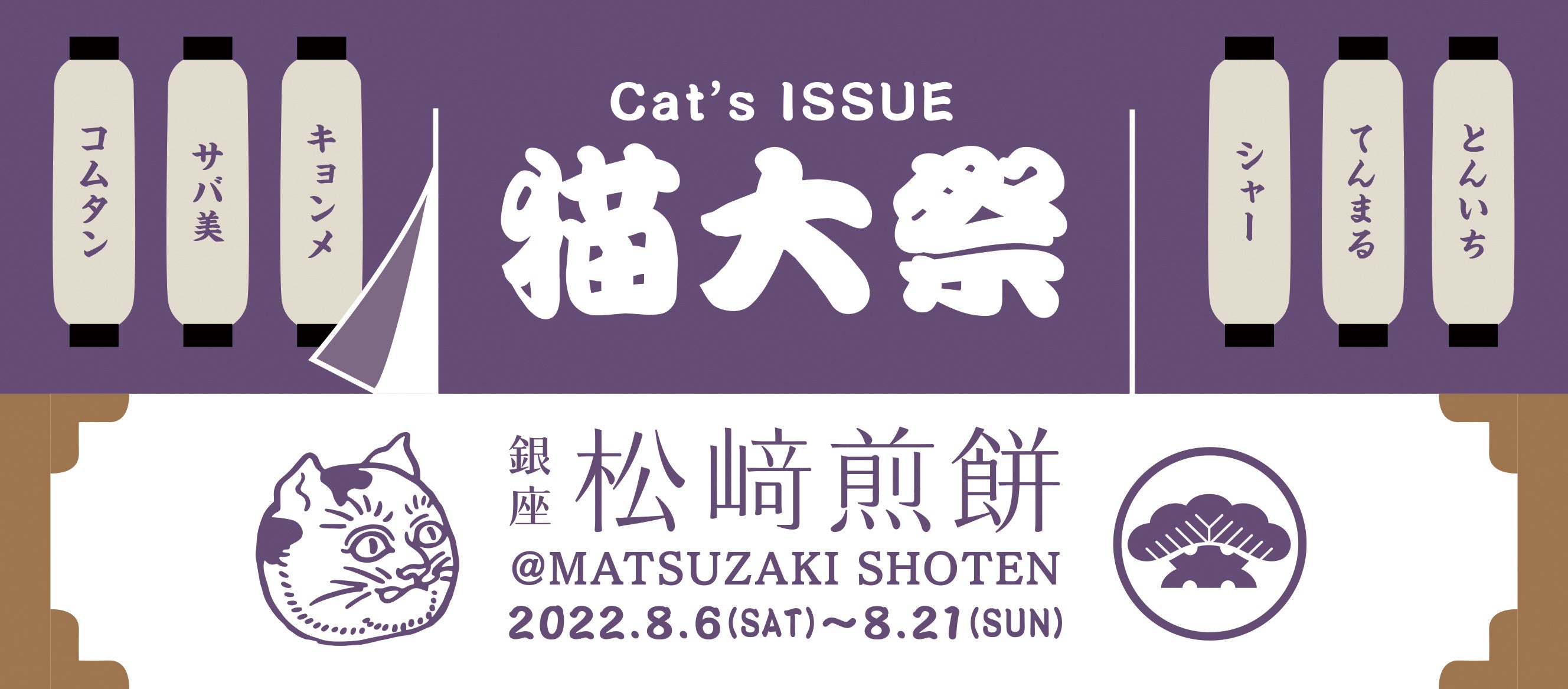銀座 松﨑煎餅の本店「MATSUZAKI SHOTEN」のコンセプトカラーであるふじ色をベースに、個性豊かな猫のイラストを描いた和テイストの手ぬぐいが登場します。