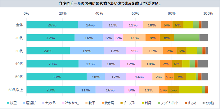 87%の方がお酒を飲む場所は自宅が多いと回答しています。お酒を買う場所はスーパーマーケットが61%、飲む頻度は週に1回以上が87%となりました。お酒はビールが最も人気があり、決まったメーカーで購入している方は25%、決まっていない方は75%でした。購入するビールは350mlの缶タイプが最も多く、美味しさを基準に選んでいるようです。家飲みのお供でのおつまみは「カロリーを気にしなくていい」「手軽さがいい」という理由から枝豆が最も人気でした。