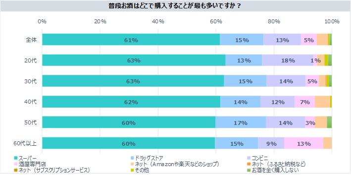 2. お酒はスーパーマーケットで61%が購入、飲酒頻度は87%が週に1回以上