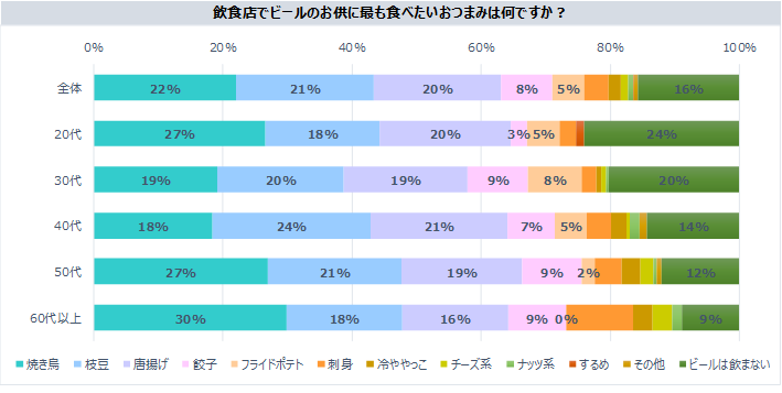 4. 飲食店でビールと一緒に食べたいものは「焼き鳥」「枝豆」「唐揚げ」が人気