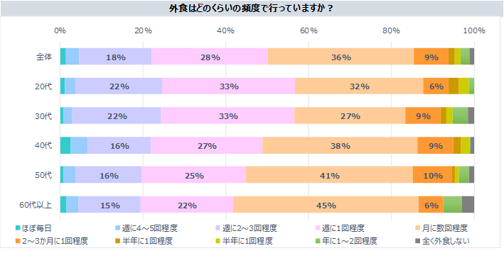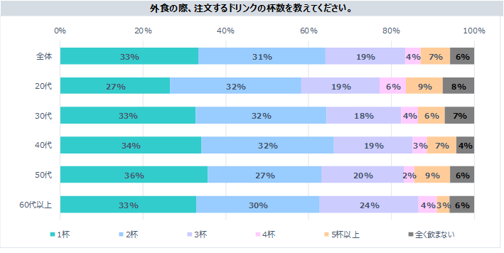 今回の調査では飲食店利用率は月数回以上と、コロナウイルスによる第7波が来ている影響はありますが飲食店利用は一時よりも活発になっていることがわかりました。しかし、注文ドリンク数は3杯以内と想定よりも少ないドリンクの注文数となりました。弊社の居酒屋利用の調査(https://www.j-roi.com/news/research/20220630-research.html)でわかっているように、短時間利用のお客様が多いことから注文数も少なくなっているのではないかと考えられます。