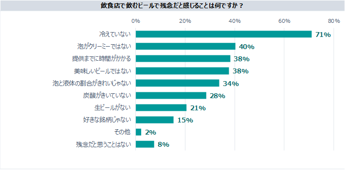外食は月に数回以上行くという人が87%、注文するドリンク数は3杯以内が87%となりました。ビールの注文数は3杯以内が82%となり、ほとんどの方が飲食店でビールを注文している結果となりました。ビールを飲みたくなる時は「仕事や運動で疲れた後」が約半数。飲食店で飲むビールにおいて「冷えていない」ことが最も残念だと感じています。ビールと一緒に食べたいものは「焼き鳥」「枝豆」「唐揚げ」が上位人気となりました。ビールから他のお酒に切り替える方は61%で、ビールの後はサワーとハイボールが多くなっています。