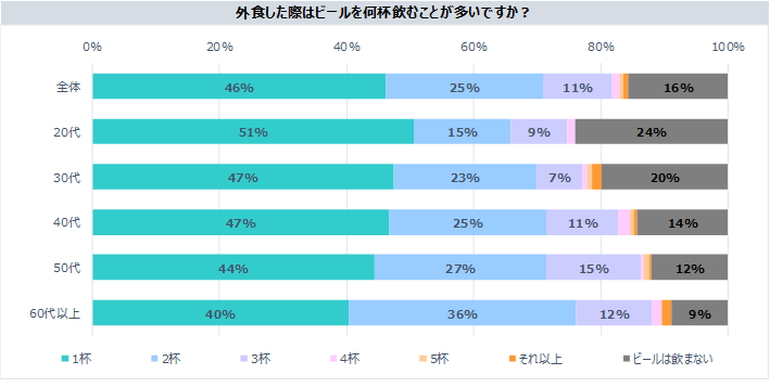注文が3杯以内という中でビールの注文率は82%と非常に高く、ほかのお酒に切り替えるとしている方も「最初の一杯は絶対にビール」と根強い人気が伺えました。本調査ではこれ以外にお酒の購入量など年代別、性別、職業別、既婚・未婚別に集計しています。