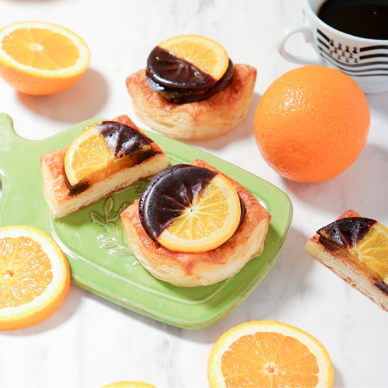 デニッシュに濃厚なベルギーチョコとオレンジをのせて、お菓子のオランジェットをイメージ しました。
