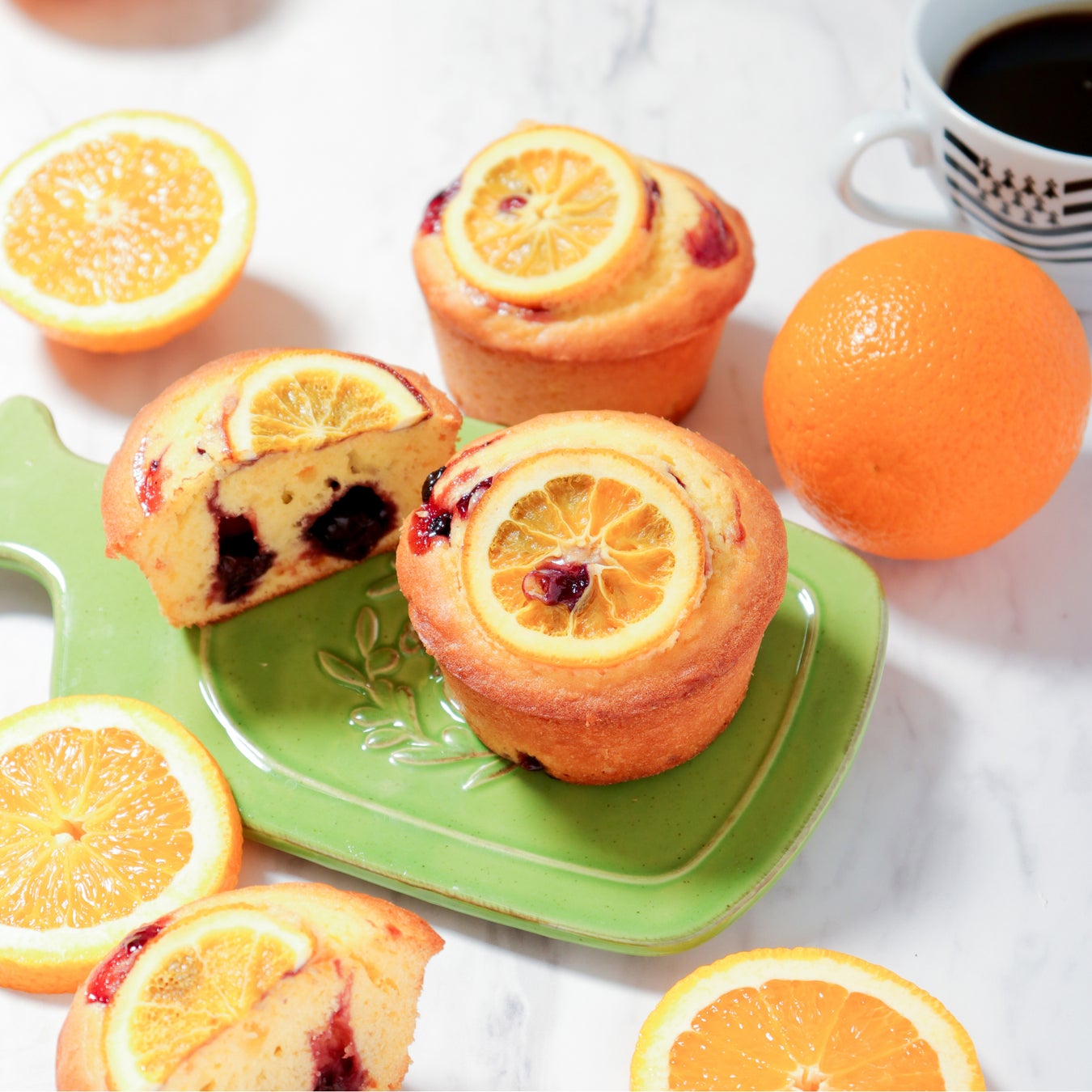 オレンジのマフィンに爽やかな酸味のカシスジャムを絞り、オレンジスライスをのせて焼き上げました。