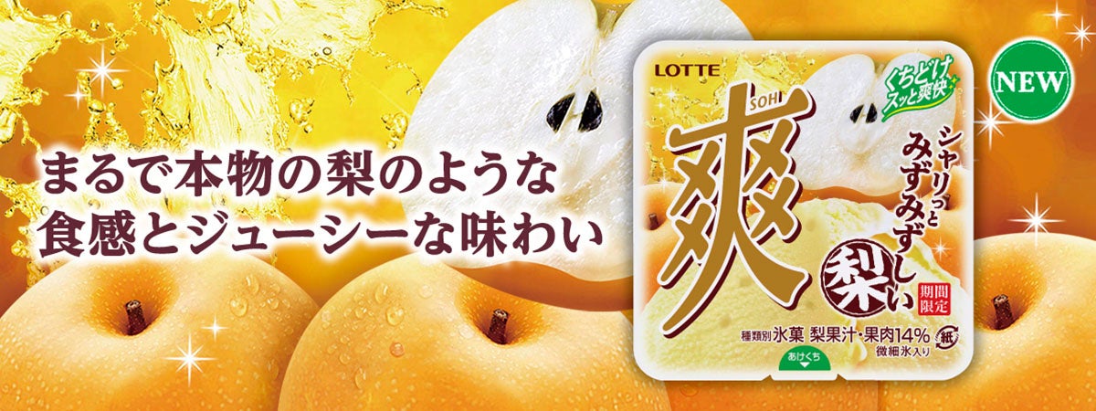 株式会社ロッテは8月8日(月)に、微細氷入りでシャリッとした食感とさっぱりとした後味が楽しめる 「爽」ブランドから、『爽 梨』を発売いたします。昨年同様に裏ごし、すりおろし、角切りの3種類の梨果肉を使用し、リアルな梨の味わいを再現しています。さらに、爽梨史上最大の微細氷サイズで梨独特のシャリシャリ食感をより感じやすくし、同じく最大量の果汁・果肉量でよりみずみずしく仕上げました。今年の『爽 梨』もぜひお試しください。