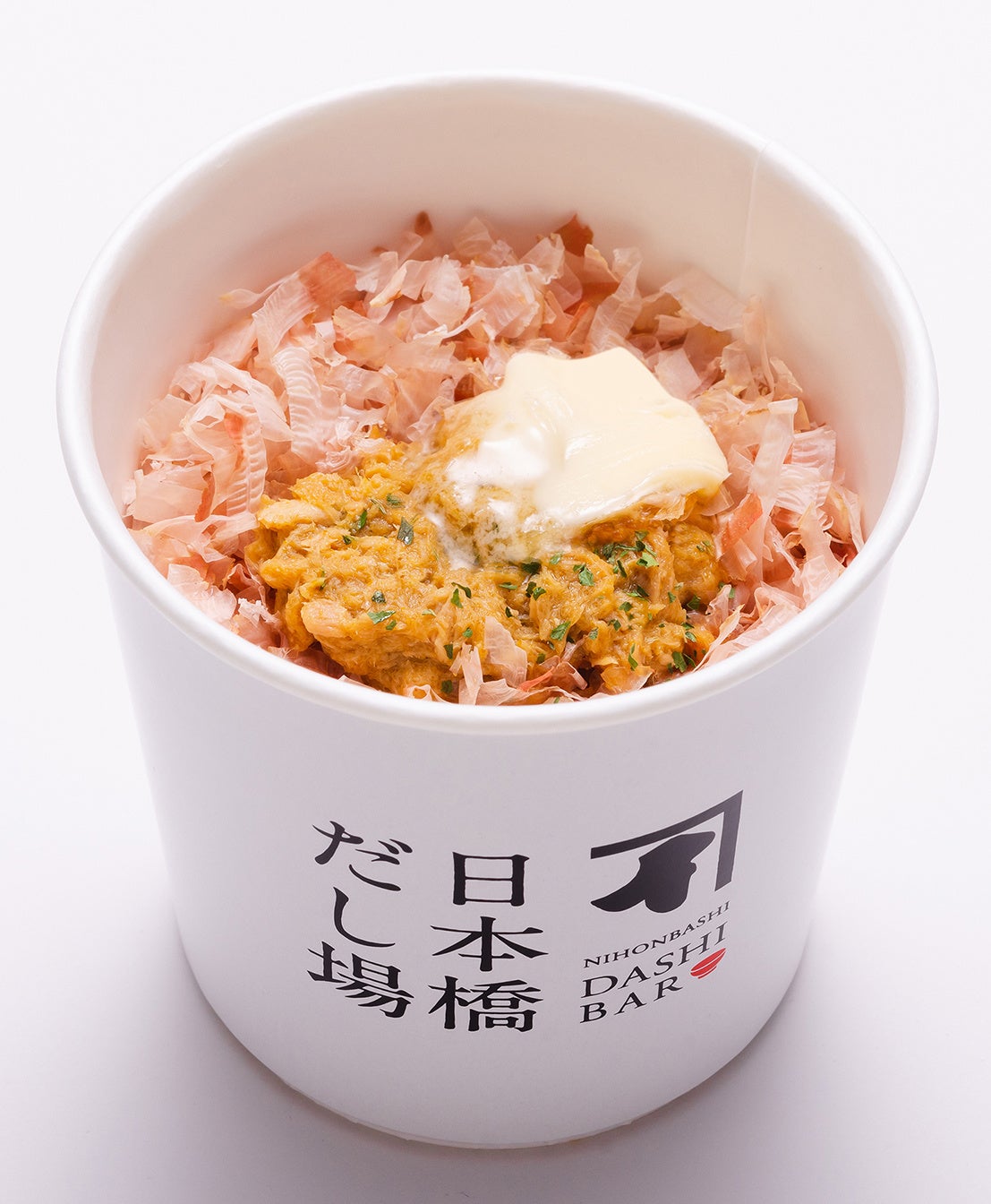 かつぶしめしにカレーとだし醤油で和えたツナと、バターをのせました。バターのコクとカレーのマリアージュをお楽しみください。