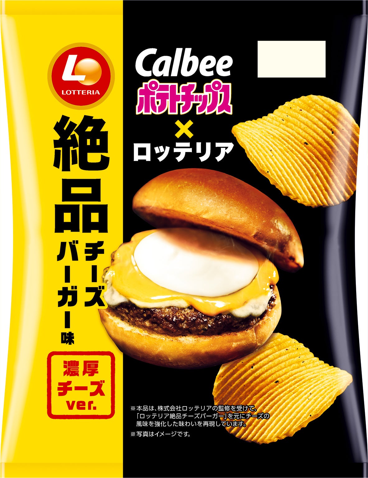 ●『ポテトチップス ロッテリア絶品チーズバーガー味』は、ロッテリア監修のもと、ジューシーなビーフの旨みと、チェダーチーズとゴーダチーズの濃厚なコクが楽しめる「絶品チーズバーガー」の味わいを再現した、厚切りVカットのポテトチップスです。今年は「絶品チーズバーガー」の味をいかしつつ、さらにカマンベール・マスカルポーネ・クリームの3種のチーズを追加し、より濃厚な味わいを実現しました。