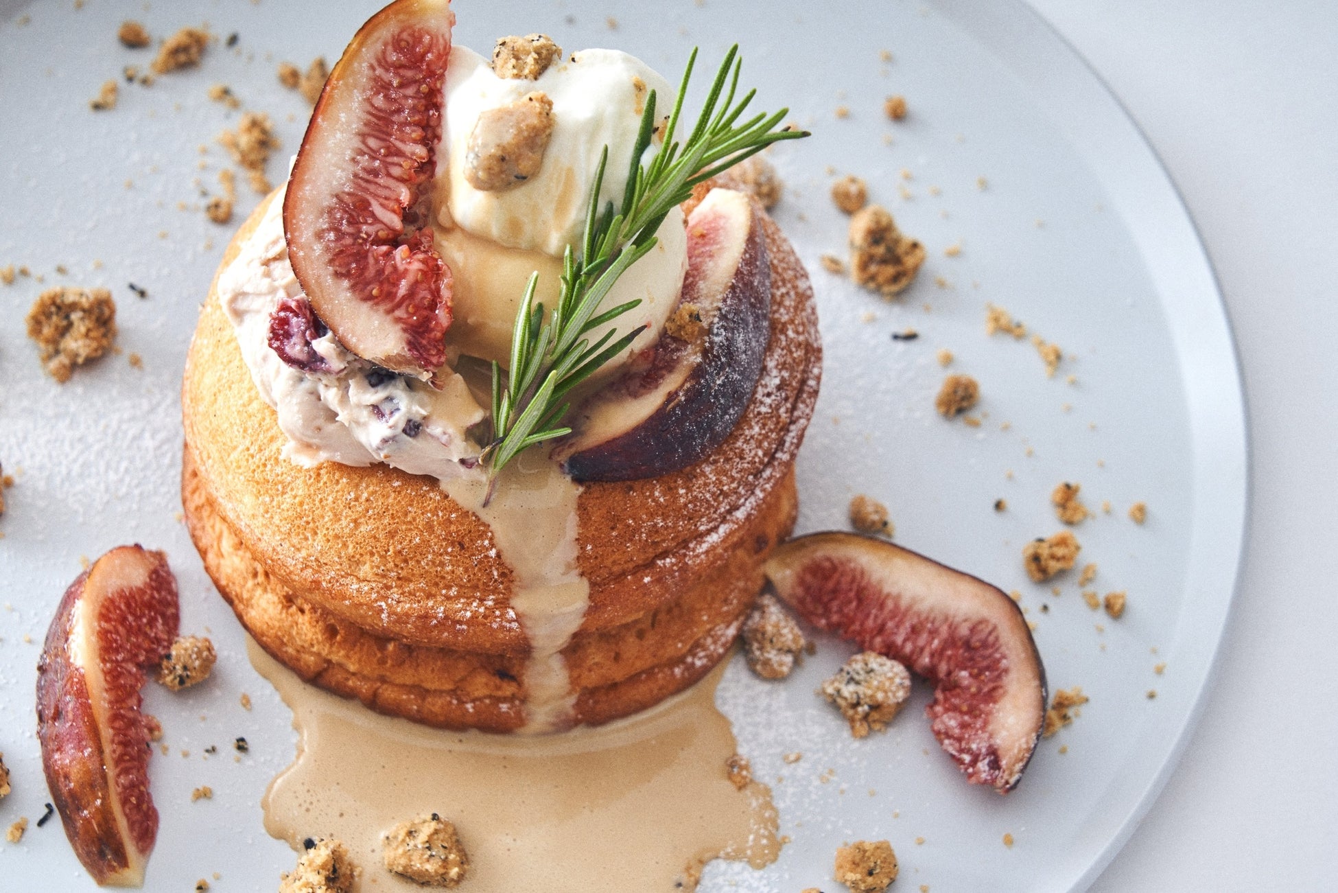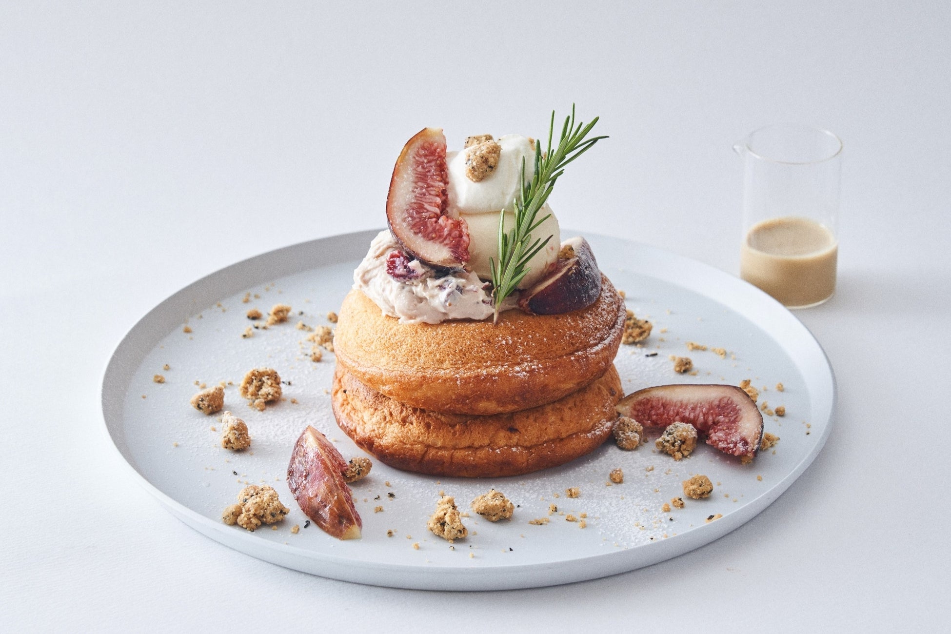 ふわふわ・もっちり丁寧に焼き上げたパンケーキ生地のうえに、旬のフレッシュいちじくにドライいちじく、ドライクランベリーを贅沢に混ぜ合わせたクリームチーズをたっぷりと。ローズマリーが香るミルクティーソースをかけることで、ふわっと華やかな香りが口いっぱいに広がります。