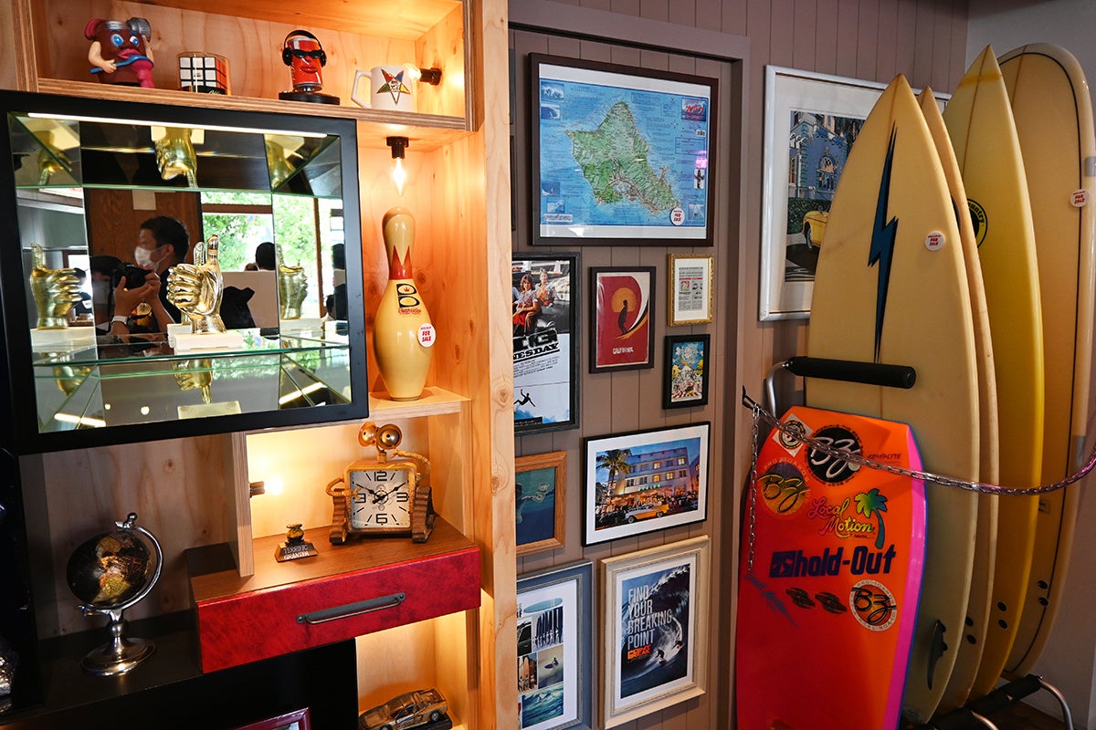 cafe内に所狭しと展示されているアンティーク家具、サーフボードポスター、昭和家電・家具、レトロポップな食器などは一部を除きなんと購入可能?! メニューだけでなく店内の隅々まで、カフェ トナリのトナリで過ごす時間をお楽しみください。(※雑貨等の販売、ECサイトのスタートは 2022.10.1 START 予定)