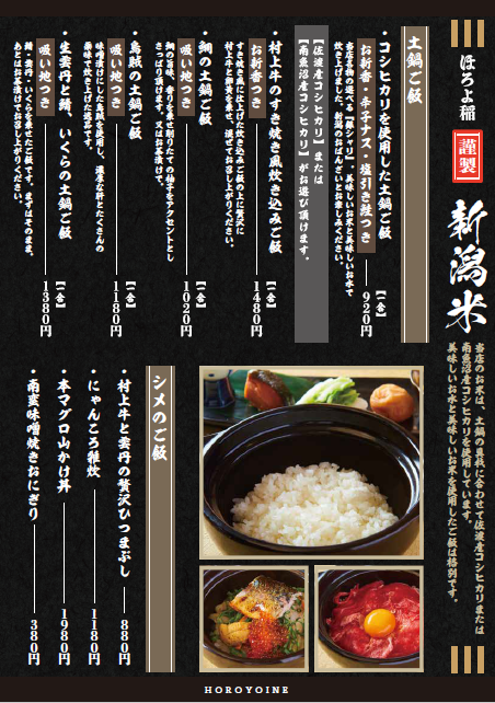 ・魚沼産コシヒカリ又は佐渡産コシヒカリ米を使用した土鍋ご飯・・・920円