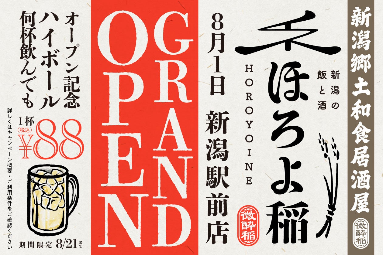 「新潟の飯と魚 ほろよ稲 新潟駅前店」のグランドオープンを記念して、何杯飲んでもハイボールを1杯88円で提供いたします。