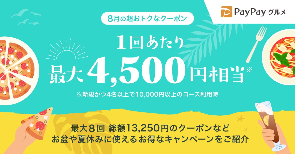 ヤフー株式会社が運営する飲食店予約サービス「PayPayグルメ」は、4,500円相当のPayPayポイントがもらえるクーポンなど、お盆休みや夏休みに使えるお得なキャンペーンを紹介します。