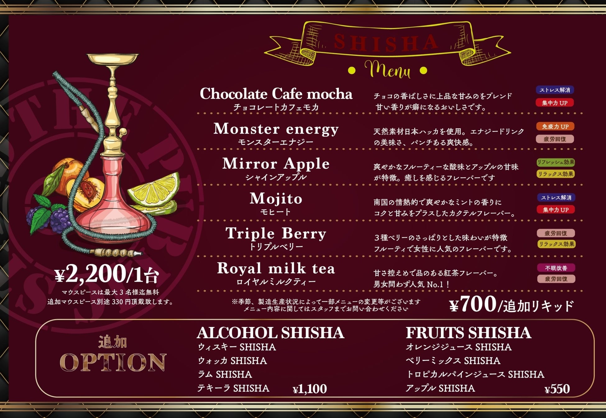 以下、各店舗のVIP利用料金に別途シーシャ利用料がかかります。