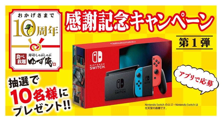 『ゆず庵』10周年記念!「Nintendo Switch®️」プレゼントキャンペーンは、『ゆず庵』公式アプリの会員様限定で開催いたします。公式アプリをダウンロードいただき、キャンペーンにご応募いただいた方の中から抽選で10名様に、「Nintendo Switch®️」をプレゼントいたします。また、抽選に外れた方の中から抽選で10名様に、『ゆず庵』でのご飲食時にご利用いただける1万円分のアプリクーポンをプレゼントいたします。