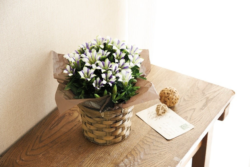 長寿のお祝いの花として親しまれている青紫と白のコントラストが美しいりんどうの鉢植えです。