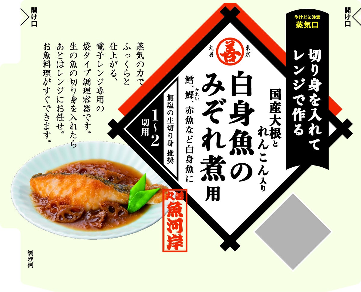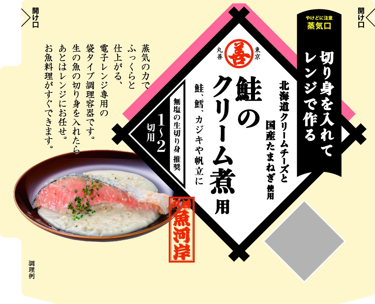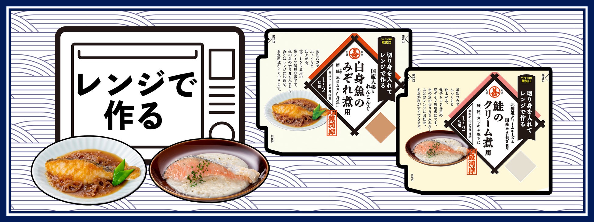 近年拡大している簡便ニーズを背景に、レンジ専用パウチにお魚の切り身を入れて、加熱するだけで煮魚を作ることができる具入り調味料「魚河岸 レンジで作る白身魚のみぞれ煮」「魚河岸 レンジで作る鮭のクリーム煮」を開発いたしました。