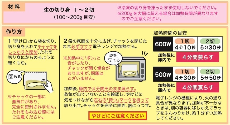 調理にかかる時間と手間をレンジを使うことで軽減し、生の魚の切り身を使うことで、食感と風味が良い一品が完成します。レンジ専⽤パウチでの加熱による「スチーム効果」と蒸らしで、お⿂がふっくらしっとりと仕上がります。