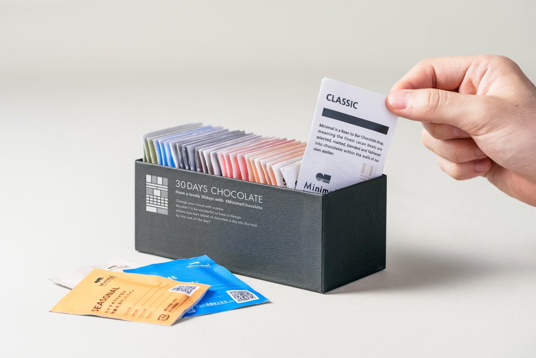 「30DAYS CHOCOLATE」では、定番フレーバーの6種×4枚と、季節ごとに変わる限定フレーバーの「SEASONAL」×6枚の計30枚のミニ板チョコレートを定期的に送料無料でお届けします。Minimalでは、2021年9月まで板チョコレートのサブスクサービスを実施していました。サービス停止後、多くのお客様から「また板チョコレートのサブスクを再開してほしい」とのお声をいただき、この度「30DAYS CHOCOLATE」を開始することとなりました。
